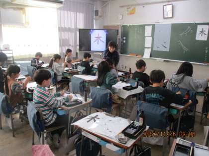 集中して取り組んでいます。 今日は「はらい」の学習で「木」を書いています。 姿勢を正して、筆を立てることを意識して 穂先の動きに気を付けて書いています。