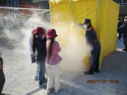 口と鼻をハンカチでふさいで 姿勢を低くして、煙ハウスの反対側のゴールを目指します。 実際に煙ハウスの中を歩くのは 怖かったようです。