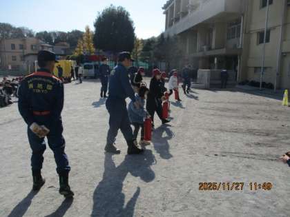 実際に放水しました。 まずは「火事だー」と大きな声で周囲に知らせて 教えていただいた消火器の使い方の通り 火元の近くに消火器を置き ホースをもって、ピンを抜き、放水!!!! 上手に消火練習ができています。