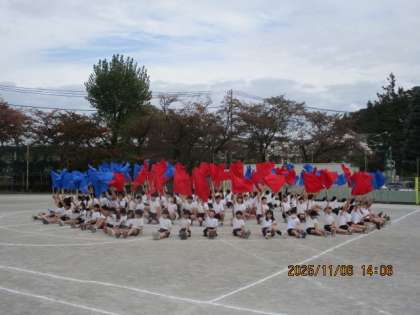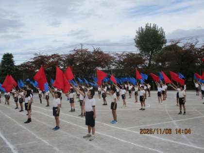 大きな旗で迫力があり みんなの動きがそろっていて美しい。 さすが高学年です。 スポーツ・フェスタのとりを務める 6年生の鼓笛もばっちり仕上がりました。
