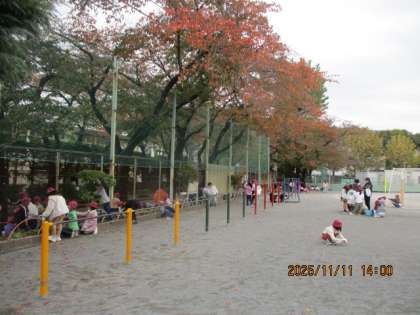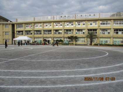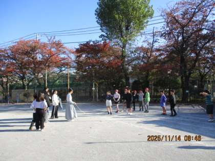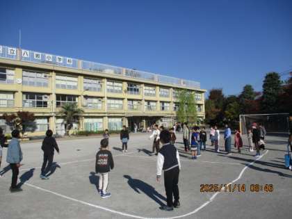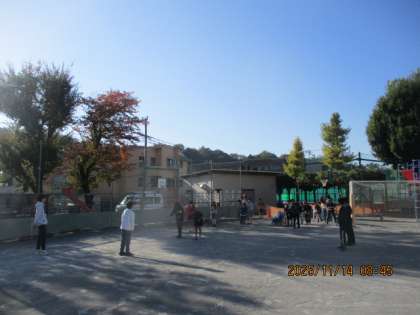 朝の時間にミニスマイルタイムが行われています。 青空に、色づいた木々の葉っぱが美しく 子供たちも朝から気持ちよく体を動かしています。 ドッチボールで当たってしまって涙ぐみ低学年の児童に 6年生がさっと寄り添って、大丈夫だよっと 優しく声をかけてくれています。