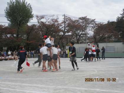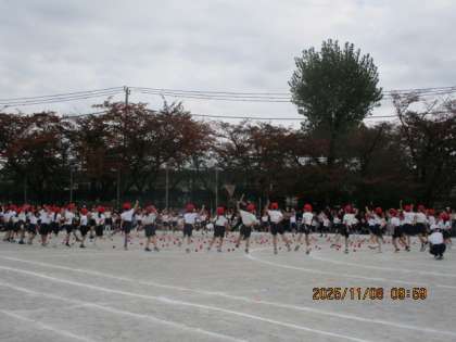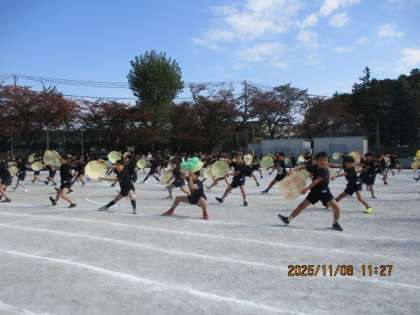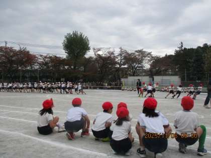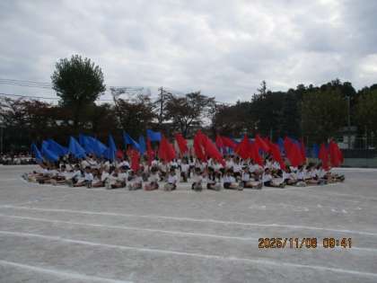 子供たちも元気いっぱい練習の成果を発揮しています。 2学年合同の集団競技 低学年:ジャンボリ玉入れ 中学年:お助け綱引き 高学年:騎馬戦 どの学年も一工夫考えた競技で 見応えがあり、会場も盛り上がりました。