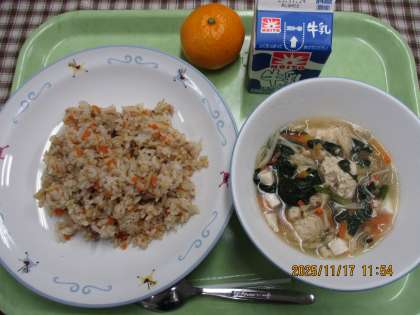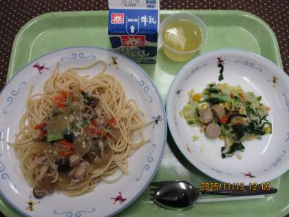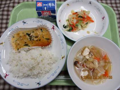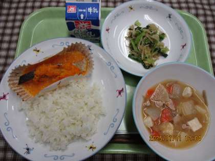 ・鮭の紅葉焼き ・野菜のごま和え ・豚汁 ・牛乳 11月7日