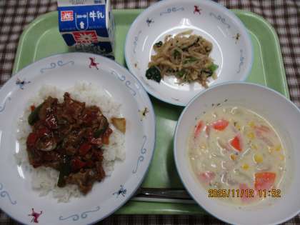 ★回鍋肉丼 ・切り干しナムル ・豆乳コーンスープ ・牛乳 11/11 クリーン運動2【全校】