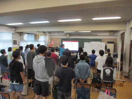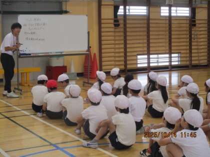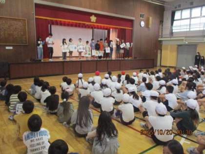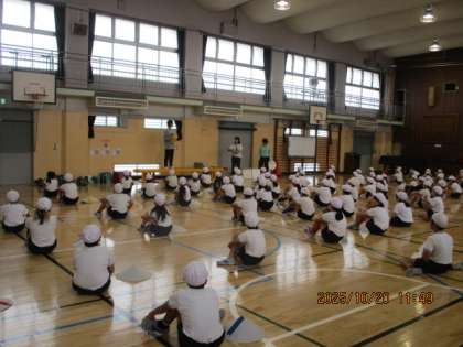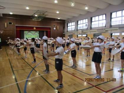 スポーツ・フェスタのスローガンが発表されました。 「全力で みんな楽しく 笑顔で最高のスポーツ・フェスタ」 このスローガンを達成できるように頑張っていきます。 さっそく、3・4年生が花笠踊りの練習です。