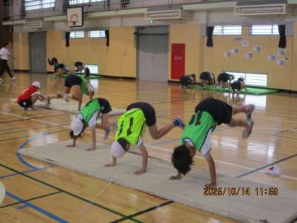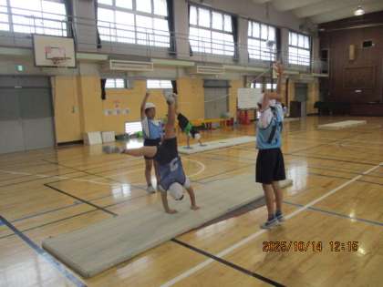 これまでに練習してきた技を組み合わせて発表をする という目標に向かって練習しています。 腕支持のための補助運動「かえるの足打ち」では ずいぶん腰が高く上がるようになっています。
