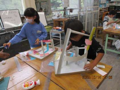 工作用紙にはさみ、カッター、ホッチキスなどを使って ビー玉が転がるコースを作っています。 うまく転がるように、ビー玉を転がして 何度も試しながら、少しずつコースを作っています。 研究者みたいに夢中になって取り組む様子が印象的です。