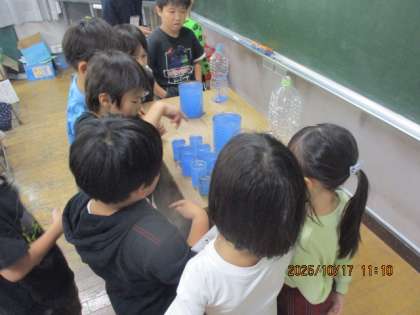 「2つの容器に入った水。どちらが多いかな。」 「どうすれば、比べられるだろう。」 という教師の投げかけに 1年生なりに一生懸命に考えています。 1デシリットルマスを使って、何杯分になるか調べて 比べることになったようです。