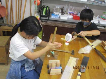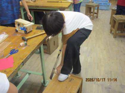 切った木を組み合わせてギコトンさんの乗り物づくりをしています。 角材、木っ端、竹ひご・・・を材料に のこぎり、金ずち、きり・・・を使って それぞれのギコトン号づくりを楽しんでいます。
