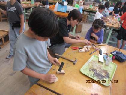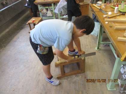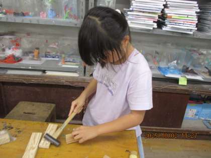 のこぎりや金づちの使い方の学習です。 木片を好きな大きさに切って 釘をトントン打ち付けて ギコトンさんという愛らしいキャラクターを 作っています。