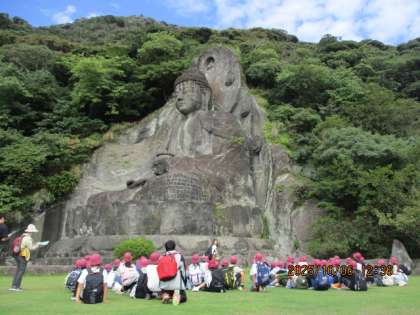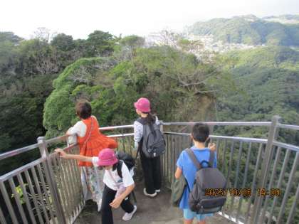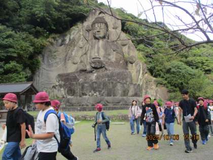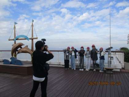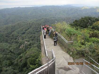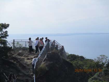 苦労して登った甲斐あり!! 山頂で班ごとに「ハイチーズ!」 最高の笑顔で記念撮影ができています。 穏やかな天気で、とても気持ちがよさそうです。 事前学習で耳にしていた地獄のぞきにもチャレンジしています。