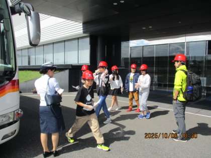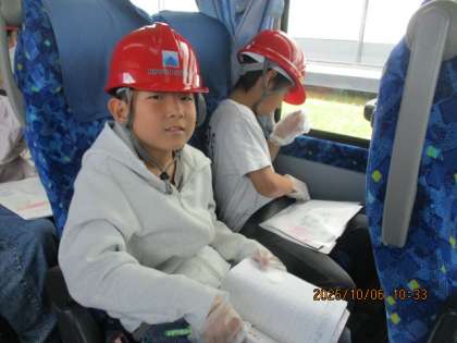 工場見学の前に、鉄について学習しています。 身の回りに多く使われている鉄は リサイクルという点で有効な資源であることがよく分かったようです。 赤いヘルメットを装着して いざ工場見学へ出発!! 工場の敷地は東京ドーム220個分という広さで 敷地内もバスで移動します。