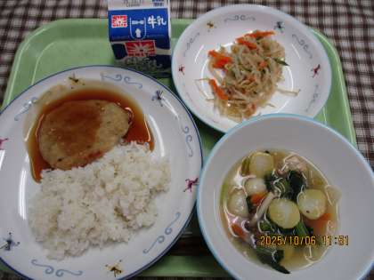 ・お魚ハンバーグ ・もやしのごま和え ・月見団子汁 ・牛乳 10/6 6年岩井移動教室10