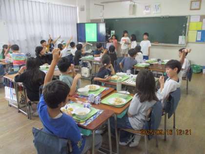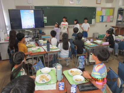 探究的な学びにチャレンジしています。 地域の農家さんのことを調べたグループが 他の学年の友達にも発表したいということで 給食中に4年生の教室で発表を聞いてもらっています。 調べて分かったことを堂々と発表できています。