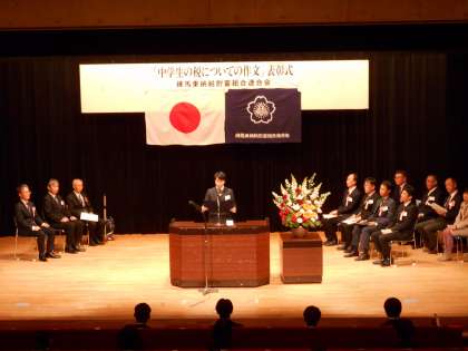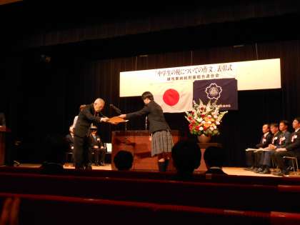 生涯学習センターで表彰式がありました。区内中学生の2252編の中から22編が入選し、本校生徒は「国税庁長官賞」を受賞し、立派に朗読を披露しました。