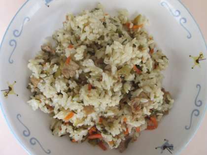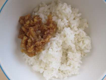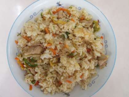 ◆豚肉と高菜のごはん: 高菜を細かく刻み、豚肉といっしょに炒め、ごはんに合わせました。豚肉と高菜のうま味たっぷりのごはんです。