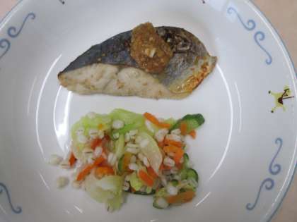 ◆さばのねぎ塩焼き:さばをねぎ、しょうが、しょうゆなどで作ったタレに漬け、焼き上げました。しょうがやねぎなどの香味野菜の香りとこんがり焼いたさばのうま味に、ごはんが進みます。