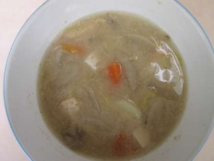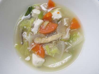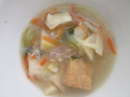 ◆広東スープ: 鶏ガラからスープをとり、豚肉、たけのこ、チンゲンサイなどが入っています。とろみがついて食べやすく、体も温まります。