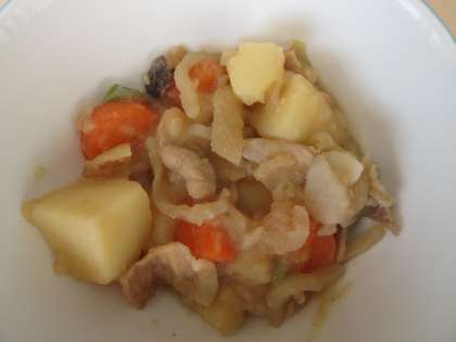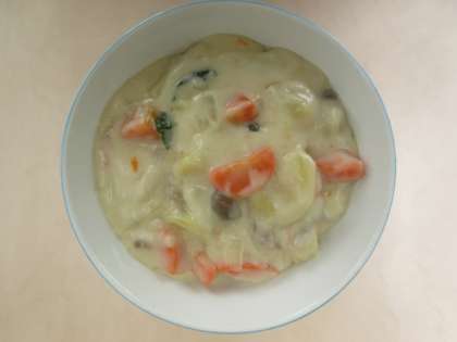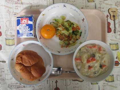 ◆さつまいもときのこのシチュー: ベーコンや鶏肉の他に、さつまいも、しめじ、マッシュルーム、玉ねぎなどが入っています。鶏ガラのスープで、クリームベースのシチューです。具だくさんで、野菜の甘みとクリームのまろやかな風味が味わえます。