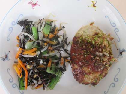 ◆お好みバーグ: 豚のひき肉に、キャベツや大豆をみじん切りにして合わせ、調味量で味を整え焼き上げました。ソースやケチャップなどから作ったタレをかけ、最後に、青のりやおかかをトッピングして、お好み焼き風にしていただきます。