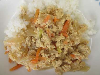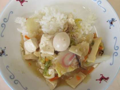 ◆豆腐の五目炒め丼: にんにく、しょうがなどといっしょに豚肉を炒め、玉ねぎやたけのこなどの野菜を加えて、スープで煮込みました。そこに、うずらたまご、豆腐、白菜などを合わせ、とろみをつけています。うま味たっぷりの具材に、ごはんが進みます。