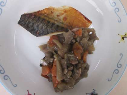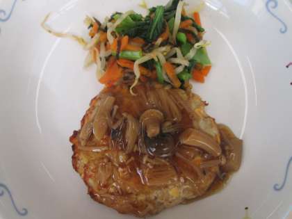 ◆アジのハンバーグきのこソース: アジのすり身を使い、玉ねぎや豆腐などを加えて形を整え、焼き上げました。そのアジバーグに、えのきやしめじなどで作ったしょうゆベースのタレをかけていただきます。アジバーグときのこソースとの相性はよく、さっぱりした味わいです。