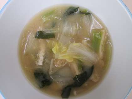 ◆白菜と油揚げの味噌汁:かつお節からだしをとり、白菜、油揚げ、小松菜、えのきなどが入っています。みその風味と白菜の甘みが美味しい体の温まる味噌汁です。