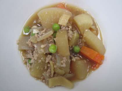 ◆厚揚げと大根のそぼろ煮: 炒めた豚のひき肉に、厚揚げ、玉ねぎ、人参、たけのこなどを加え、出汁で煮込んでいます。出汁をたっぷり吸った具材が美味しく、ご飯が進みます。