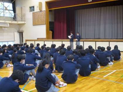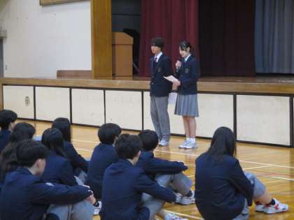 12月3日水曜日に第3学年の学年朝礼が行われました。今回の朝礼では、来週から実施される整備委員のキャンペーンの説明を行いました。年末が近くなり、大掃除を実施する時期になったため、身の回りの机やロッカー内をきれいに整理整頓しようというキャンペーンになります。このキャンペーンをきっかけに日ごろから教室環境の整備の意識を一層高くしていきましょう。