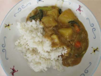 ◆冬野菜カレーライス: 豚肉、玉ねぎをワインやにんにくなどといっしょに炒め、鶏ガラのスープを加えて煮込んでいます。最後に、ごぼう、れんこん、じゃがいもなどの冬野菜に、ルーや調味料を加えています。スパイシーなカレー風味に、冬野菜の香りと食感が楽しめます。