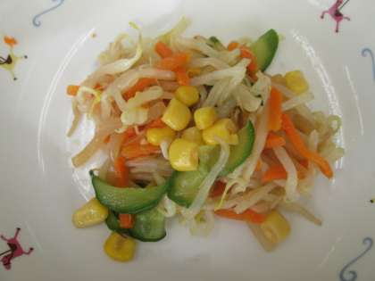 ◆もやしのピリ辛サラダ: もやし、にんじん、小松菜などの野菜の食感に、にんにくや唐辛子の香りがアクセントになっています。