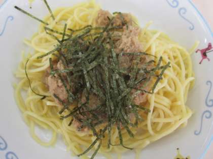 ◆練馬スパゲッテイー: 練馬大根をおろし、ツナや調味料を加えました。その具材をパスタにたっぷりかけ、最後に、刻みのりをトッピングしました。具材がパスタにからみ、大根のさっぱりした甘み、ツナのうま味、のりの香りが味わえます。