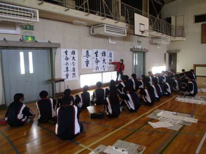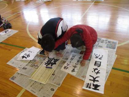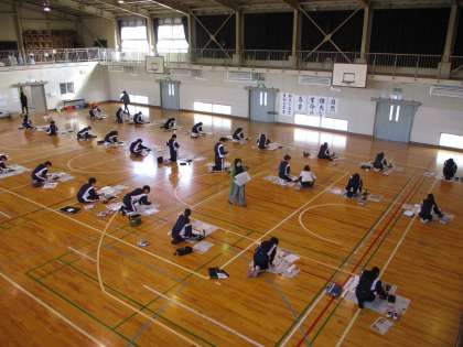 12月9日火曜日に体育館で地域連携の書写の授業が行われました。書初めに向けて懸命に取り組む様子がありました。