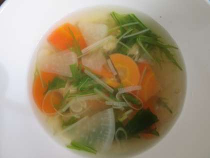 ◆大根と水菜のすまし汁: かつお節から出汁をとり、大根、鶏肉、人参、水菜などが入っています。透き通った出汁の効いたお汁で、ほどよい塩味と香りがたまご丼によく合います。