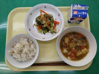 鶏肉と生揚げの煮物 野菜の塩昆布和え 579キロカロリー なまあげとは、とうふの水を切って油であげたものです。煮込んでも形がくずれないので、煮物にぴったりな食材です。 たんぱく質やカルシウムも多くふくまれています。 |