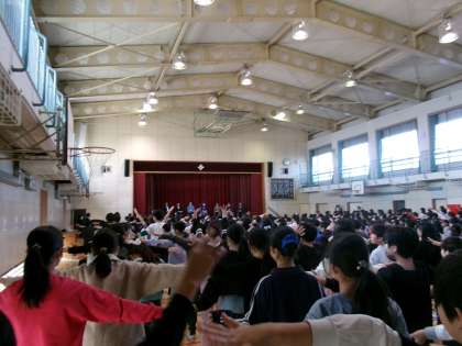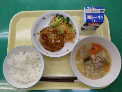 ブロッコリーのサラダ 豚汁 569キロカロリー いわしとタラのミンチをハンバーグにしました。しょうがのすりおろしやみそを入れてお魚の臭みを消しました。骨がないので魚を食べるのが苦手な人も食べやすい料理です。 【1年生】学習発表会の練習