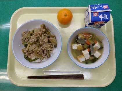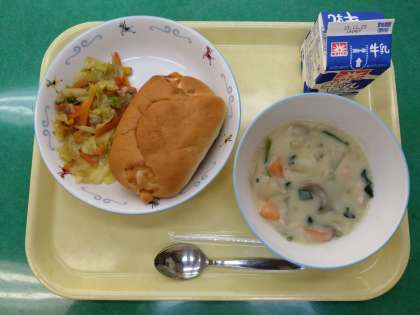 キャベツとあさりのソテー 豆乳のクリームシチュー 575キロカロリー 今日は牛乳ではなく豆乳を使ったクリームシチューです。 豆乳は大豆からできています。大豆には「サポニン」という栄養がふくまれています。おなかのちょうしをよくしてくれたり、血液をさらさらにしてくれるといわれています。 【全学年】感謝の気持ちを伝える会