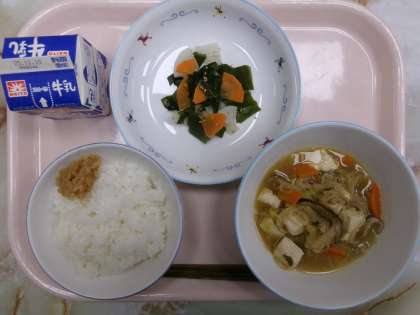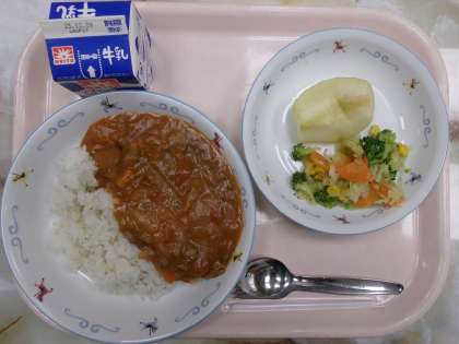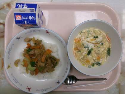 台湾の定番料理「ルーローハン」が給食に登場です。八角などの香辛料の風味も楽しめる本格的な味付けでした。「煮込み肉のご飯かけ」という意味になるのだそうです。生揚げが入ってボリュームたっぷりのたまごスープと一緒に美味しくいただきましょう。