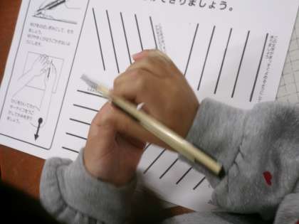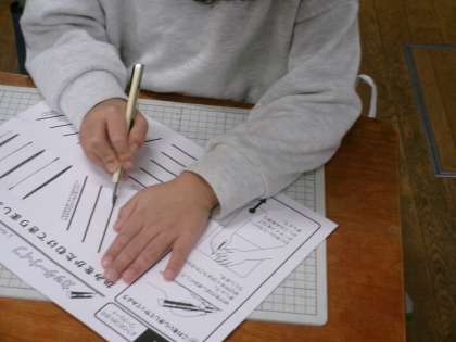 今日はカッターナイフの使い方を教わって、実際に紙の線に沿って切る練習中です。