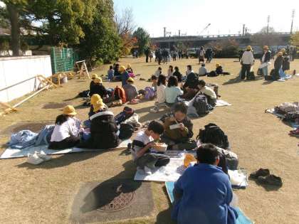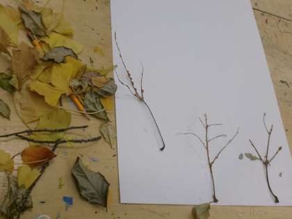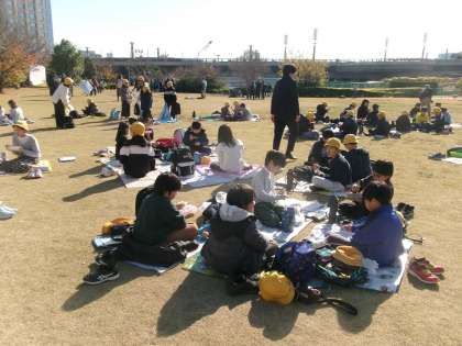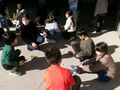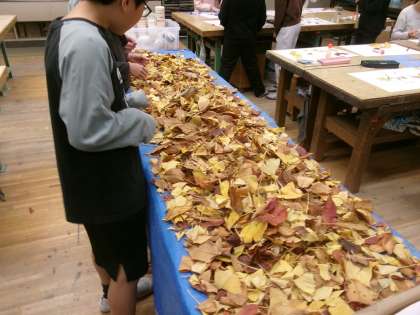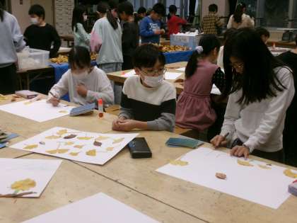 校庭の落ち葉や枝を利用して、絵画作品を作成中です。落ち葉の色や形を使ってどんな世界を作ろうか。たくさんの葉っぱからお目当てのものを探す姿も真剣です。