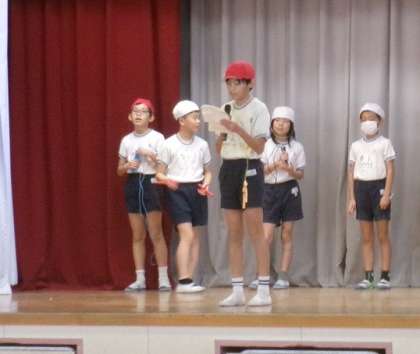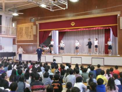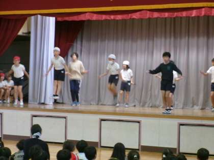 今日から始まる「なわとび月間」に向けて、運動委員会の5・6年生がお手本を紹介してくれました。終わりの5分で挑戦するリズムなわとびも綺麗に決めてくれています。なわとびタイム中は、下級生の記録確認などでも活躍してくれます。