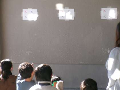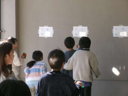 ピロティの日陰になる部分に目印となる紙を用意し、みんなで鏡で反射させた日光を一定の時間あて続けました。