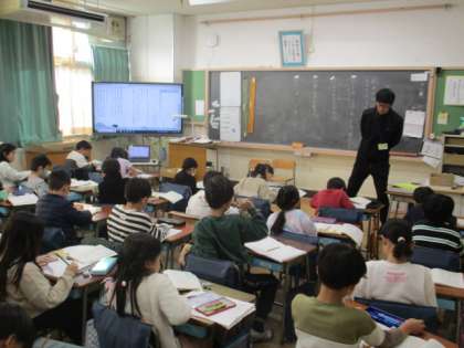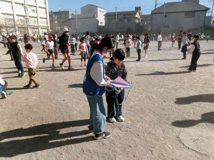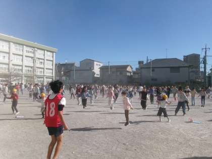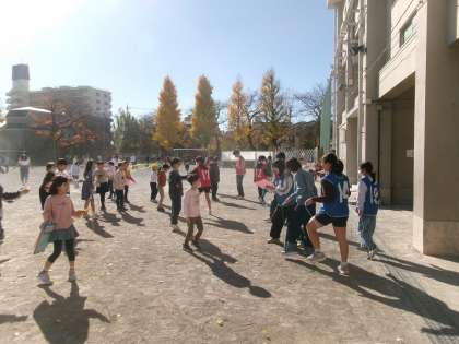 今日から始まる「なわとびタイム」です。ゼッケンを身に着けた運動委員会のみんなが、下級生の記録確認を行ってくれています。そして最後のリズムなわとびではWANIMAの「やってみよう」の音楽に合わせて跳んでいきます。歌詞にあわせて「やってみよう」というコールが起きるなど、元気に取り組んでいます。