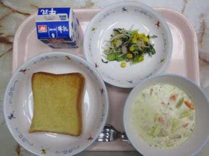 チャウダーというと、ハマグリやアサリなどが入ったクラムチャウダーが有名です。今日の給食は、鮭の角切りを入れた「サーモンチャウダー」です。 チャウダーという名前は、フランス語の「大鍋、煮込む」という言葉から来ているそうです。しかし、チャウダーはアメリカを代表する料理の一つとなっています。 アメリカでは、地域によって味付けが異なります。日本でよく知られている白いスープ仕立てなのが「ニューイングランド風」、トマトを加えた赤いスープが「マンハッタン風」、魚介の澄んだスープで作られる「ロードアイランド風」など、それぞれの地域独自のチャウダーが作られているそうです。 今日もおいしくいただきましょう。