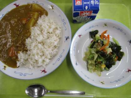 子供たちが大好きなカレーライス。スパイスの香りと辛さのバランスが絶妙な仕上がりです。きっとどのクラスでも食缶が空になることでしょう。また、赤色や緑色などの海藻が入った彩豊かなサラダもカレーライスによく合います。海藻の色の違いを楽しみながら食べてほしいと思います。