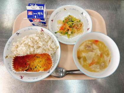 さつまいもピラフ、キャベツ入りミートローフ、ペイザンヌスープ、牛乳