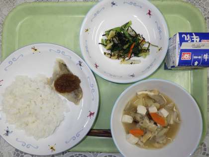 今日のふりかけも給食室で手作りしました。ひじき・削り節・ゆかりに調味料を加え、焦がさないようによく混ぜながら炒り煮して作ります。しっとりしたふりかけでした。子供たちもごはんと一緒によく食べていました。