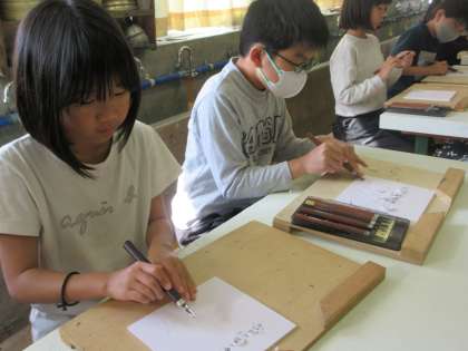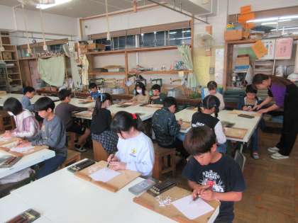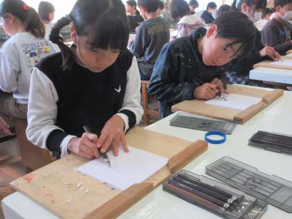 4年生の図工の様子です。彫刻刀を使って版画の学習をします。