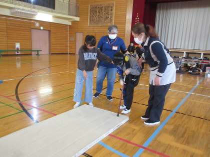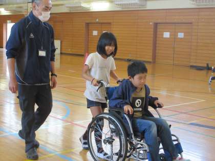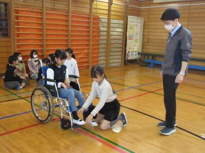 足が不自由な方やお年寄りを車いすで移動させる体験と目や耳、足などが不自由な方を介助する体験をしました。