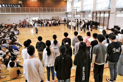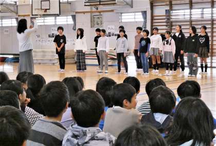 1曲目は「となりのトトロ」です。運動会が終わった後から、音楽の授業で当たり前のように歌わせてきたのですが、「トトロを知らない子がいるのでは?」とふと心配になって子供たちに聞いてみたら、「知らない」と答えた子が半分くらいいるクラスもあって驚きました。楽曲自体はトトロを知らなくても楽しく歌えてしまうのですが、知らないままではもったいないと思い、映画のほんの一部分ですが、歌詞と関係のある場面だけ子供たちと一緒に見ることにしました。子供たちは大喜びです。初めて見る子も、何回も見たことがある子も、「大きい!」「かわいい!」「すごーい!」とつぶやきながら、食い入るように見ていました。その反応は何年生でも同じで、改めてトトロのすばらしを実感しました。 2曲目は「さんぽ」です。この曲も「となりのトトロ」の冒頭で流れてくる曲で、いろいろなところで歌われているので知らない子はいないくらいです。でも、登場人物のメイのイメージで歌うとより心が弾んできます。 3曲目は「天空の城ラピュタ」のテーマ曲「君をのせて」です。5年生の教科書にも載っている曲で、2部合唱用に編曲されています。この編曲がとにかくすばらしくて、どちらのパートも何度歌っても飽きません。昨年度の音楽会で歌った6年生も、今年度の1学期に取り組んだ5年生も大好きな曲です。せっかくなので、5・6年生だけの二部合唱を1〜4年生の子供たちに聴いてもらうことにしました。クラスごとの授業の中でしか練習をしてこなかったので、本当に声が出るのかどうか不安もあったのですが、本番では響きのあるすてきな歌声で堂々と歌っていて感心しました。 さらに、5・6年生の音楽委員14名だけの二部合唱にも挑戦してもらいました。特別な合唱団ではないので、前日の委員会活動の中で15分くらいしか練習できなかったのですが、少ない人数にも関わらず、透き通ったきれいな声で見事に歌いきっていました。 最後に、全校児童で「君をのせて」を大合唱して終わりました。高学年の歌声を聴いて、下の学年の子供たちが憧れをもって引き継いでいく。旭町小学校の歌声はこのようにして受け継がれていくのだなと改めて思わせてくれた音楽朝会でした。子供たちに感謝です。 11月6日(木)